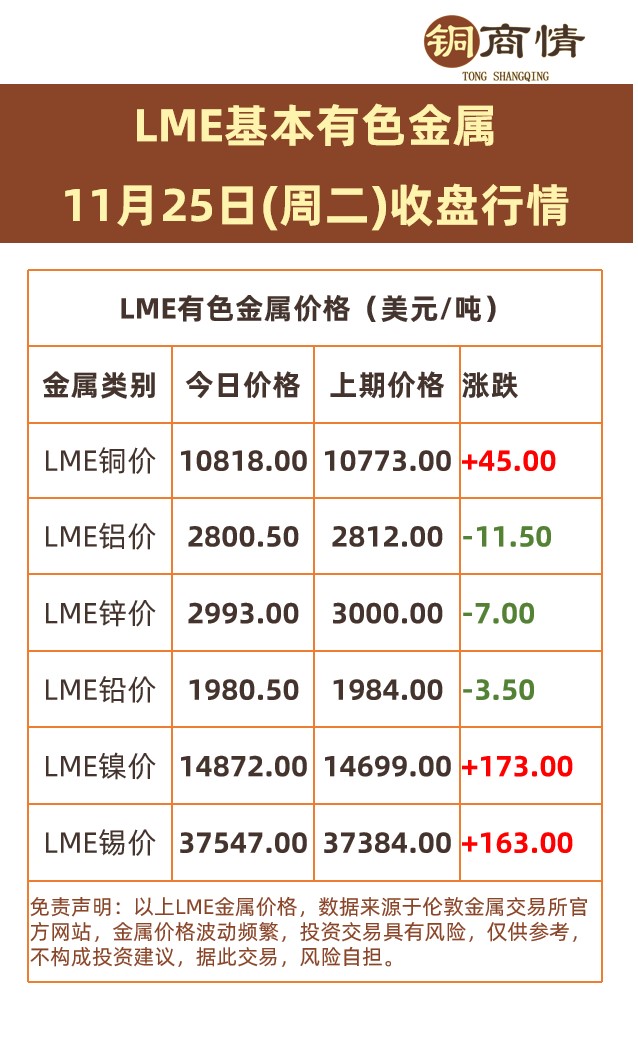 LME铜价大涨逼近1.1万美元/吨,创11月内新高!发表时间:2025-11-27 09:42 11月26日,LME三个月期铜收涨1.45%至10975美元/吨,盘中触及1.1 万美元/吨以上的近一个月高位。本轮铜价上行由宏观与微观双重逻辑共 同驱动! 宏观层面:美国10月零售销售增幅低于预期叠加消费者信心趋弱,强化 了市场对美联储12月降息的预期。低利率环境通过降低企业融资成本, 间接提振了铜作为工业金属的需求前景,为铜价提供宏观支撑。